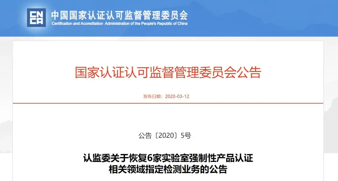 認(rèn)監(jiān)委關(guān)于恢復(fù)6家實(shí)驗(yàn)室強(qiáng)制性產(chǎn)品認(rèn)證相關(guān)領(lǐng)域指定檢測(cè)業(yè)務(wù)的公告按照《認(rèn)監(jiān)委關(guān)于對(duì)4家實(shí)驗(yàn)室部分強(qiáng)制性產(chǎn)品認(rèn)證指定檢測(cè)業(yè)務(wù)進(jìn)行停業(yè)整頓的公告》(認(rèn)監(jiān)委公告2019年第23號(hào))、《認(rèn)監(jiān)委關(guān)于對(duì)湖北中檢檢測(cè)有限公司等6家單位撤銷暫停部分強(qiáng)制性產(chǎn)品認(rèn)證指定檢測(cè)業(yè)務(wù)的公告》(認(rèn)監(jiān)委公告2018年第50號(hào))要求,深圳天祥質(zhì)量技術(shù)服務(wù)有限公司廣州分公司、安徽省產(chǎn)品質(zhì)量監(jiān)督檢驗(yàn)研究院、東北電力電器產(chǎn)品質(zhì)量檢測(cè)站、國網(wǎng)湖北省電力有限公司電力科學(xué)研究院、吉林省產(chǎn)品質(zhì)量監(jiān)督檢驗(yàn)院、國家電機(jī)及機(jī)械零部件產(chǎn)品質(zhì)量監(jiān)督檢驗(yàn)中心已完成相應(yīng)整改工作。經(jīng)我委組織專家現(xiàn)場(chǎng)核查驗(yàn)證,上述6家實(shí)驗(yàn)室在相應(yīng)領(lǐng)域的檢測(cè)能力和規(guī)范性已符合強(qiáng)制性產(chǎn)品認(rèn)證相關(guān)要求。根據(jù)有關(guān)規(guī)定,現(xiàn)決定即日起恢復(fù)上述6家實(shí)驗(yàn)室承擔(dān)的相關(guān)領(lǐng)域強(qiáng)制性產(chǎn)品認(rèn)證指定檢測(cè)業(yè)務(wù),具體業(yè)務(wù)范圍如下:一、深圳天祥質(zhì)量技術(shù)服務(wù)有限公司廣州分公司:恢復(fù)其室內(nèi)加熱器產(chǎn)品(CNCA-C07-01:家用及類似用途設(shè)備 室內(nèi)加熱器)強(qiáng)制性產(chǎn)品認(rèn)證指定檢測(cè)業(yè)務(wù)。二、安徽省產(chǎn)品質(zhì)量監(jiān)督檢驗(yàn)研究院:恢復(fù)其電動(dòng)自行車(CNCA-C11-16:電動(dòng)自行車)強(qiáng)制性產(chǎn)品認(rèn)證指定檢測(cè)業(yè)務(wù)。三、東北電力電器產(chǎn)品質(zhì)量檢測(cè)站:恢復(fù)其“額定短時(shí)耐受電流Icw≤40kA”的低壓成套產(chǎn)品(CNCA-C03-01:低壓電器 低壓成套開關(guān)設(shè)備)強(qiáng)制性產(chǎn)品認(rèn)證指定檢測(cè)業(yè)務(wù)。四、國網(wǎng)湖北省電力有限公司電力科學(xué)研究院:恢復(fù)其低壓成套產(chǎn)品(CNCA-C03-01:低壓電器 低壓成套開關(guān)設(shè)備)強(qiáng)制性產(chǎn)品認(rèn)證指定檢測(cè)業(yè)務(wù)。五、吉林省產(chǎn)品質(zhì)量監(jiān)督檢驗(yàn)院:恢復(fù)其電線電纜產(chǎn)品(CNCA-C01-01:電線電纜產(chǎn)品)強(qiáng)制性產(chǎn)品認(rèn)證指定檢測(cè)業(yè)務(wù)。六、國家電機(jī)及機(jī)械零部件產(chǎn)品質(zhì)量監(jiān)督檢驗(yàn)中心:恢復(fù)其摩托車用外部照明及光信號(hào)裝置(CNCA-C11-07:機(jī)動(dòng)車外部照明及光信號(hào)裝置)強(qiáng)制性產(chǎn)品認(rèn)證指定檢測(cè)業(yè)務(wù)。